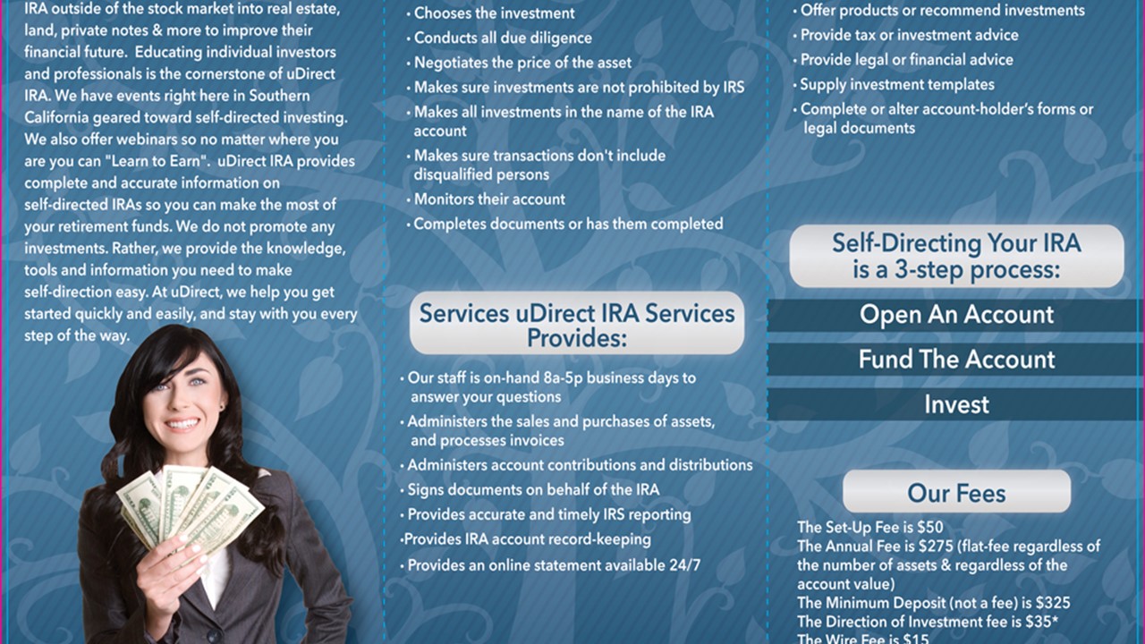uDirect IRA Services has helped thousands of Americans invest their IRA outside of the stock market into real estate, land, private notes & more to improve their financial future. Educating individual investors and professionals is the cornerstone of uDirect IRA. We offer webinars so no matter where you are you can “Learn to Earn”.